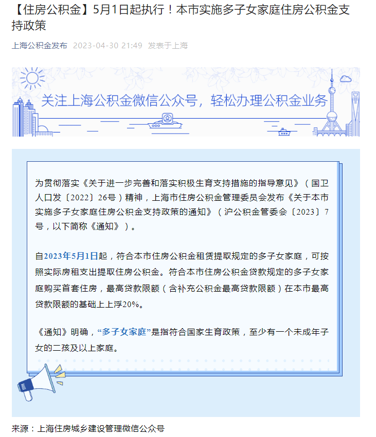 4月30日晚,据官方微信公众号“上海公积金发布”,为贯彻落实《关于进一步完善和落实积极生育支持措施的指导意见》(国卫人口发〔2022〕26号)精神,上海市住房公积金管理委员会发布《关于本市实施多子女家庭住房公积金支持政策的通知》(沪公积金管委会〔2023〕7号,简称《通知》)。