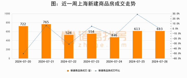 根据上海市房地产交易中心数据显示,2024年07月26日上海新建商品房成交613套,较昨日持平