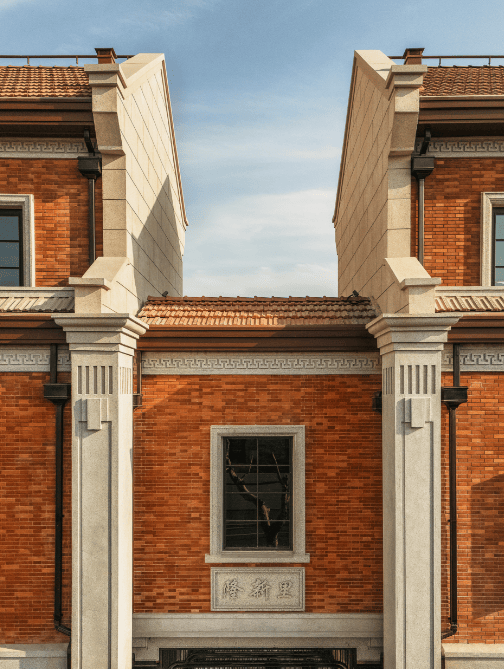 建筑立面更多保留了在地历史建筑的肌理,大面积的红砖使用,水刷石壁柱柱头和线脚配以云纹装饰,通过纯粹、细腻的视觉表达,完成城市的颜值主义,漫步其中犹如穿越时光,沉浸式体验一场上海生活的精致优雅。