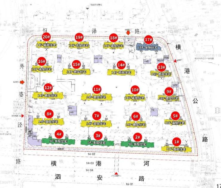 14-01地块:占地面积约6.09万方,总建筑面积约18.24万方,容积率2.0,由16栋14-18F高层住宅、3栋5F多层住宅、1栋18F保障房以及若干配套用房组成;