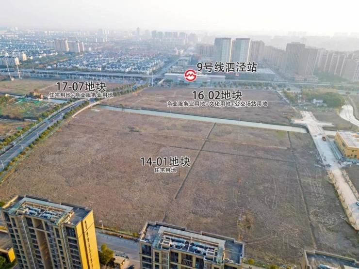 项目位于9号线泗泾站地铁上盖,东至洞泾港,南至泗陈公路,西至外婆泾路,北至恒泽路,共计由3幅地块组成,包含住宅、商业、文体等多种业态。