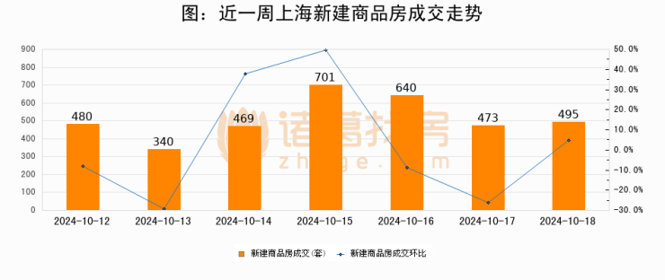 根据上海市房地产交易中心数据显示,2024年10月18日上海新建商品房成交495套,较昨日增加22套,环比上涨4.7%