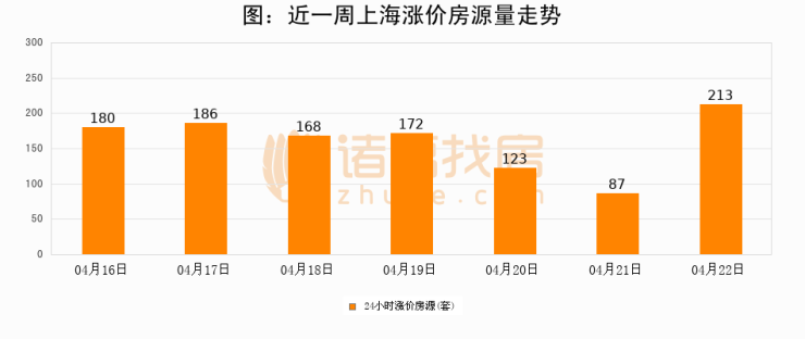 根据诸葛找房数据显示,上海24小时涨价房源量为213套,较04月21日增加126套,环比上涨144.8%。与此同时,涨价房源占比小幅扩大,业主信心有所提升。