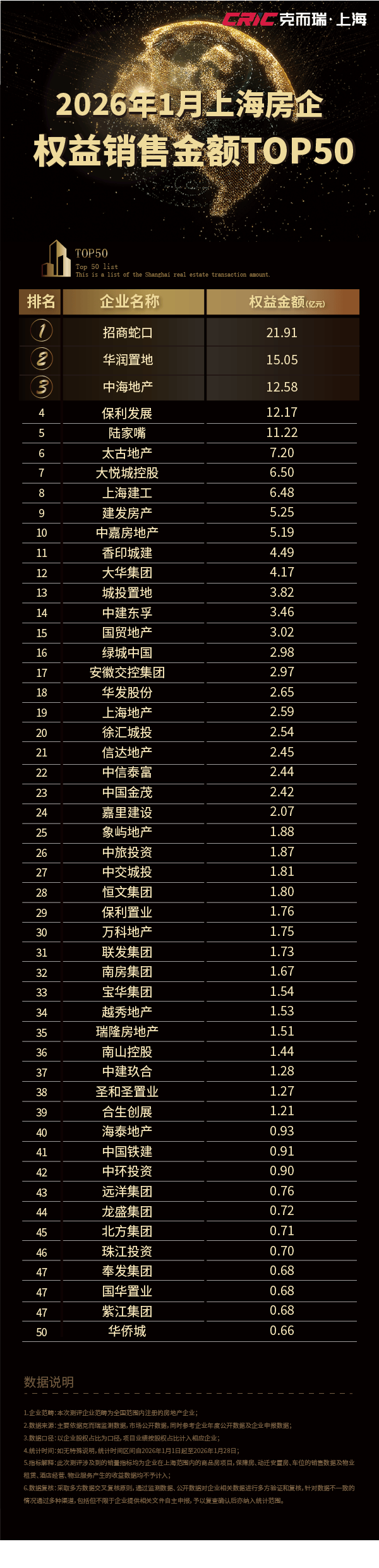 招商蛇口暂居榜首!2026年1月上海房企权益销售TOP50发布