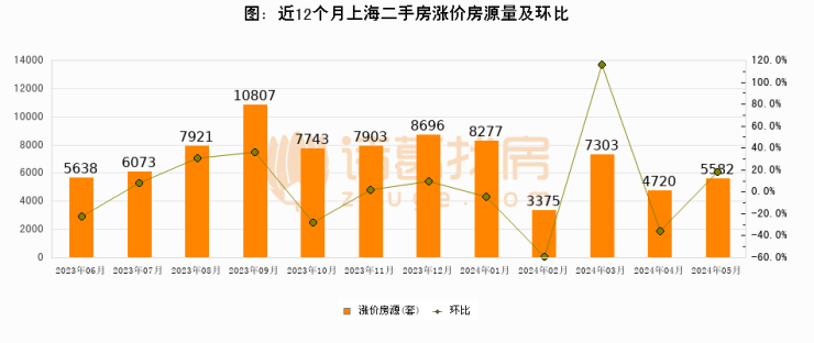 从调价房源来看,2024年5月,上海涨价房源为5582套,较上月上涨18.3%。上海近两个月涨价房源量在4720套以上波动。与此同时,本月涨价房源占比回升,业主信心有所提振。