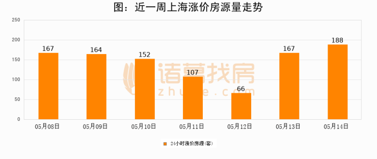 根据诸葛找房数据显示,上海24小时涨价房源量为188套,较05月13日增加21套,环比上涨12.6%。与此同时,涨价房源占比小幅扩大,业主信心有所提升。