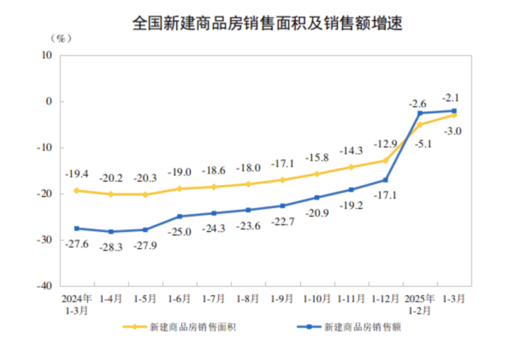 国家统计局:2025年一季度新建商品房销售面积21869万平方米,同比下降3%