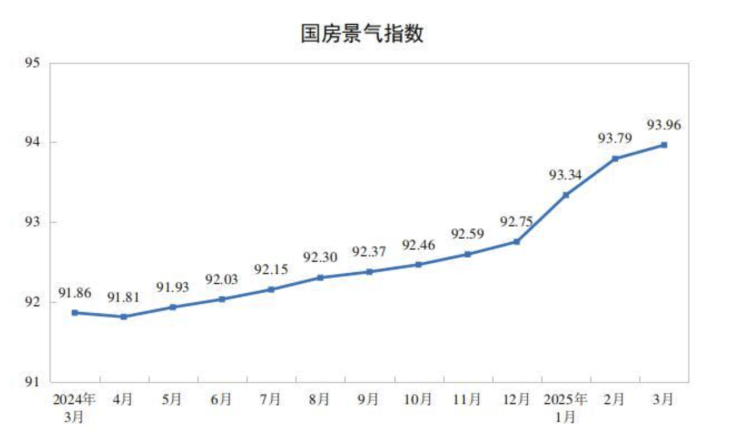 3月份,房地产开发景气指数(简称“国房景气指数”)为93.96。