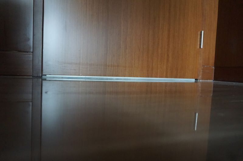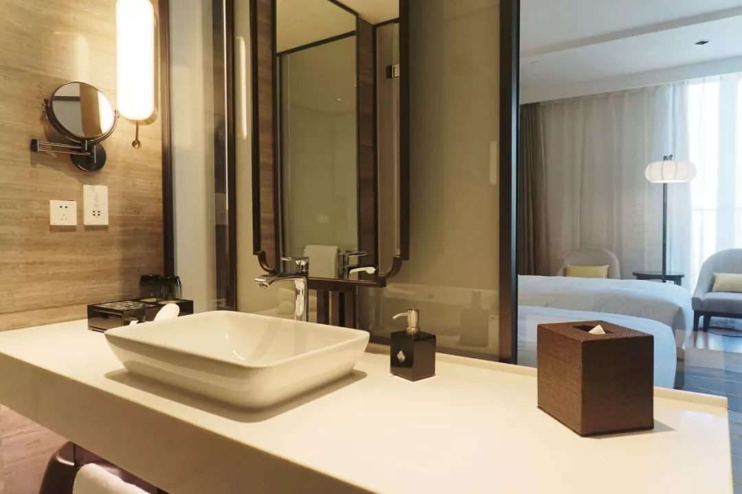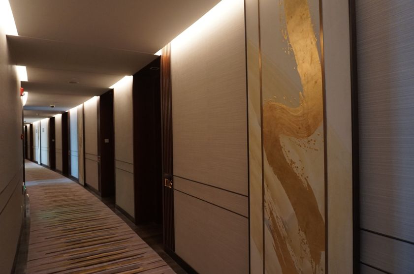 客房门是整个隔声体系中最薄弱的环节,声学顾问要求门顶部与侧边均安装橡胶密封条,门底部安装可自动下沉的密封条,增加门的隔声量,最终隔声测试结果为26dB。