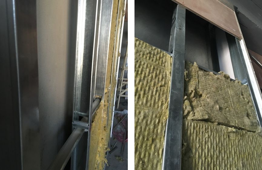 客房中幕墙与楼板之间的空隙,声学建议里面先用岩棉塞实,再用钢板或铁片封死。