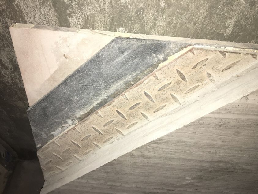 客房卧室地面面层是木地板(金属龙骨),撞击声压级足够;而客房入口处装修层为石材,硬质地面产生的撞击声(高跟鞋踩踏地面、行李搬运等)对下部空间有影响,声学上采用了橡胶减震垫的隔声措施。