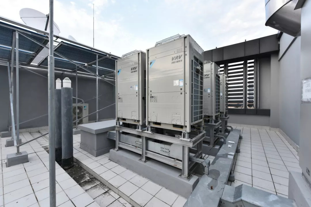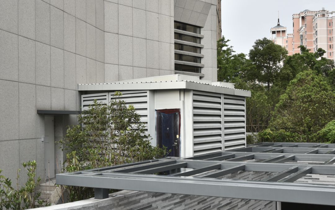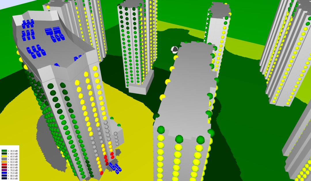 1F室外有若干台VRV及排风机,声学顾问模拟计算了其排放噪声对周边环境的影响,并提出降噪消声措施。