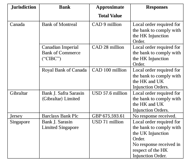 然而,多家银行在回复中明确表示,仅凭香港或英国法院命令不足以作为采取冻结措施的法律依据,需要取得当地法院签发的正式命令方可执行;也有银行未就此作出实质回应。