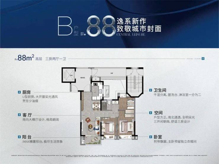 建面约88㎡不仅做到了3房,还是3开间朝南,市面上实属罕见!