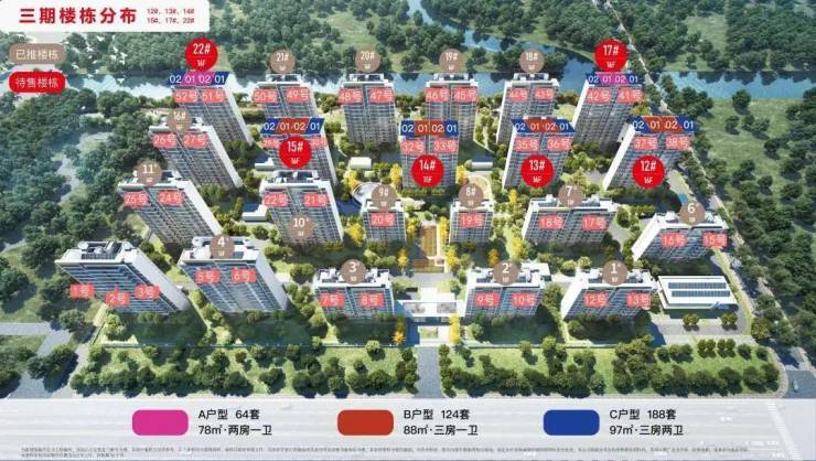 据悉,此次收官三期,推出的房源位置更佳,社区中央景观+瞰景优质位置。包括建面约78㎡2房64套、约88㎡3房124套、约97㎡3房188套。