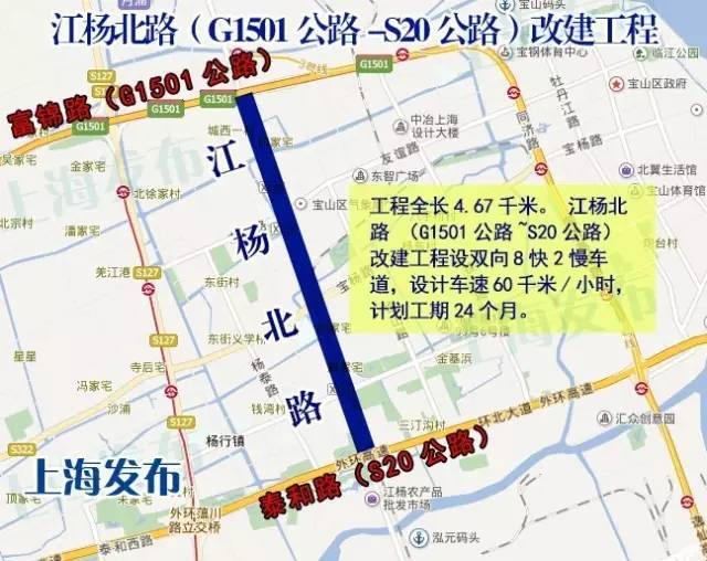 江杨北路(G1501公路-S20公路)改建工程南起泰和路(S20公路),北至富锦路(G1501公路),全长4.67千米,设双向8快2慢车道,设计车速60千米/小时,计划工期24个月。改建完成后,将对蕰川路、逸仙路南北向通道起到扩容与分流作用。