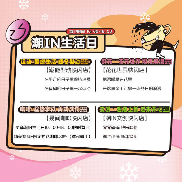 在高·尚领域潮IN街区生活节「新年季」活动中,我们将聚焦商业样态、文化交流和互动体验三大主题,在活动形式上我们也有所创新。本次生活节将打造“运动 · 酷燃生活 暖冬型动“、”鲜花 · 花花世界 限定浪漫“、”咖啡 · 趁热拿铁 美式成真“、”文创 · 趣店上新 进来开心“4间潮IN快闪店。