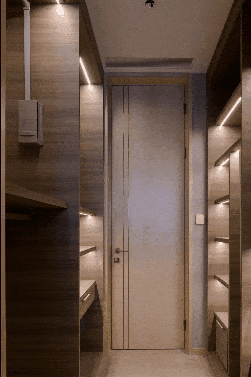 衣帽间内的下拉式挂衣杆和镜柜,通过微妙的设计处理,满足多种使用场景