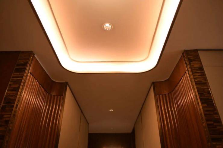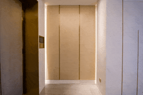 地库的入户大堂,同样延续了海派文化的尊贵和内涵。硬朗的线条造型加之颜色的冲突对比以及灯光氛围的烘托,使得整个空间大气、富有仪式感但并不缺乏归家的温馨。