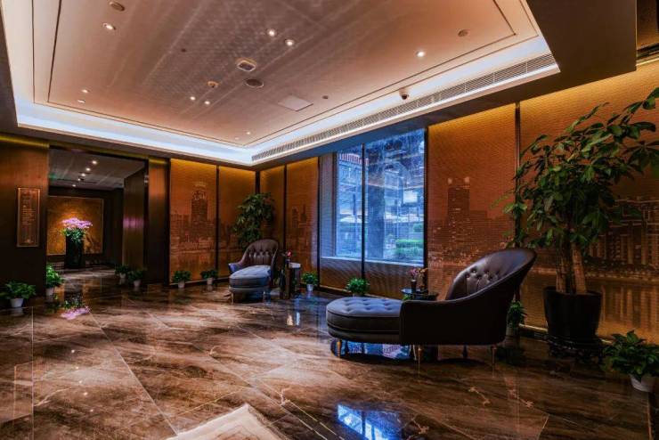 入户大堂为精致的ART-DECO风格,入口门头与墙地面的繁复线性图案呼应万国建筑的立面线条。金属、玻璃和大理石巧妙平衡搭配,细节展现出老上海兼容并蓄的文化脉络。