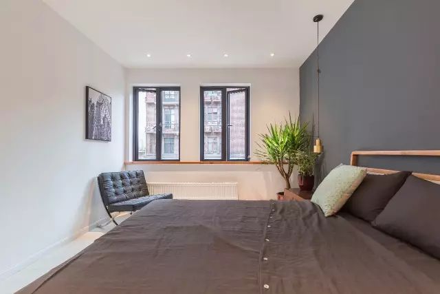 次卧的墙体采用纯白与深灰两种色调