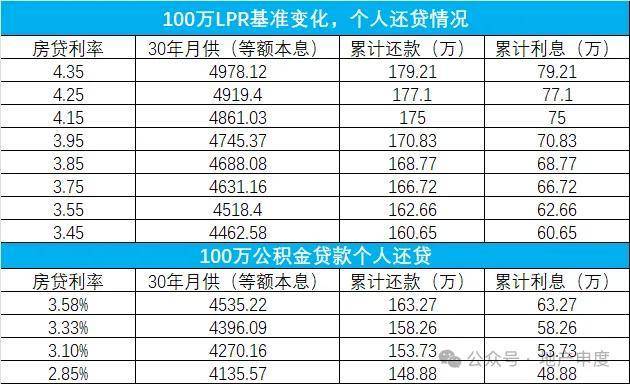 同样以家庭100万公积金贷款为例,等额本息30年,首套月供从4535降至4396元,二套月供从4270元降到4135元,虽然总体降幅不大,不过总还款额能减少数万元。