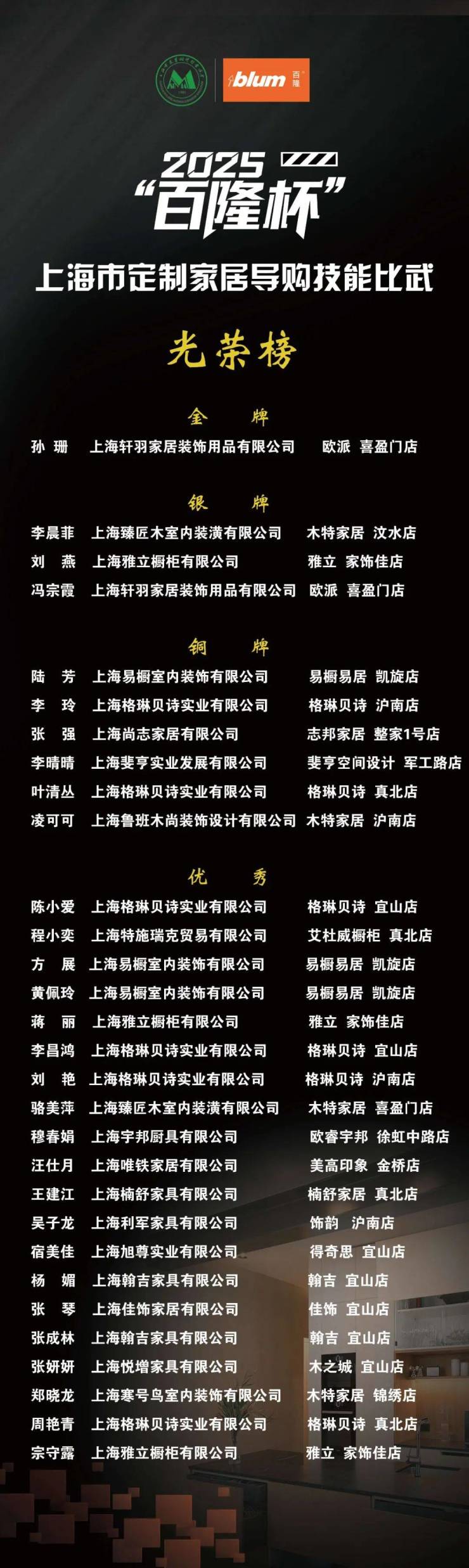 近日,百隆家具配件(上海)有限公司联合上海市建筑材料行业协会定制家居分会主办的2025“百隆杯”上海定制家居导购技能比武在上海喜盈门圆满落幕!历时2个多月,活动覆盖60余家门店或品牌,143名导购报名,116人次参加线上答题,从培训,到初赛,复赛层层闯关,理论考核、情景模拟、实战演练等多维度竞技。